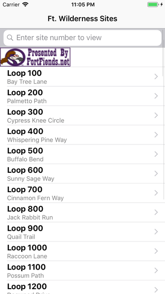 ด้วย Fort Wilderness Sites ผู้ใช้สามารถเรียกดูแคมป์ไซต์ได้อย่างง่ายดายตามลูปหรือค้นหาหมายเลขไซต์ที่ต้องการ แอปยังให้ข้อมูลมีค่าเช่นความยาวและความกว้างของแผ่นคอนกรีตบนแต่ละไซต์ ตำแหน่งของสิ่งอำนวยความสะดวก (น้ำ/บ่อบำบัดน้ำเสีย/ไฟฟ้า) และแม้กระทั่งความยากลำบากในการถอยรถเข้าไปในแต่ละไซต์